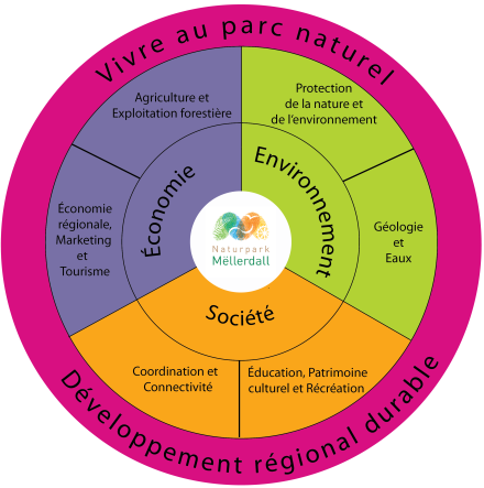 La ligne directrice du Parc naturel « Mëllerdall » s’oriente aux trois piliers du développement durable, c’est-à-dire « l’économie, l’écologie et le social ».